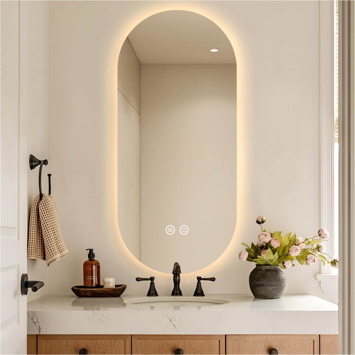 Oval Backlit Bathroom Mirror with Lights, Pill-Shaped LED Lighted Vanity Mirror for Wall, Anit-Fog, Stepless Dimmable, Memory Function